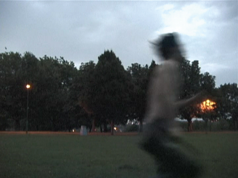 A male gure carries a tape player which plays pornographic sound tracks and runs in early morning in a park. After a couple minutes, his physical strength de- clines. Round by round, his panting, coughing and spitting sound mingles with the sound tracks. Besides, the sound fades in and out because of the distance between the half naked runner and the position of the camera.