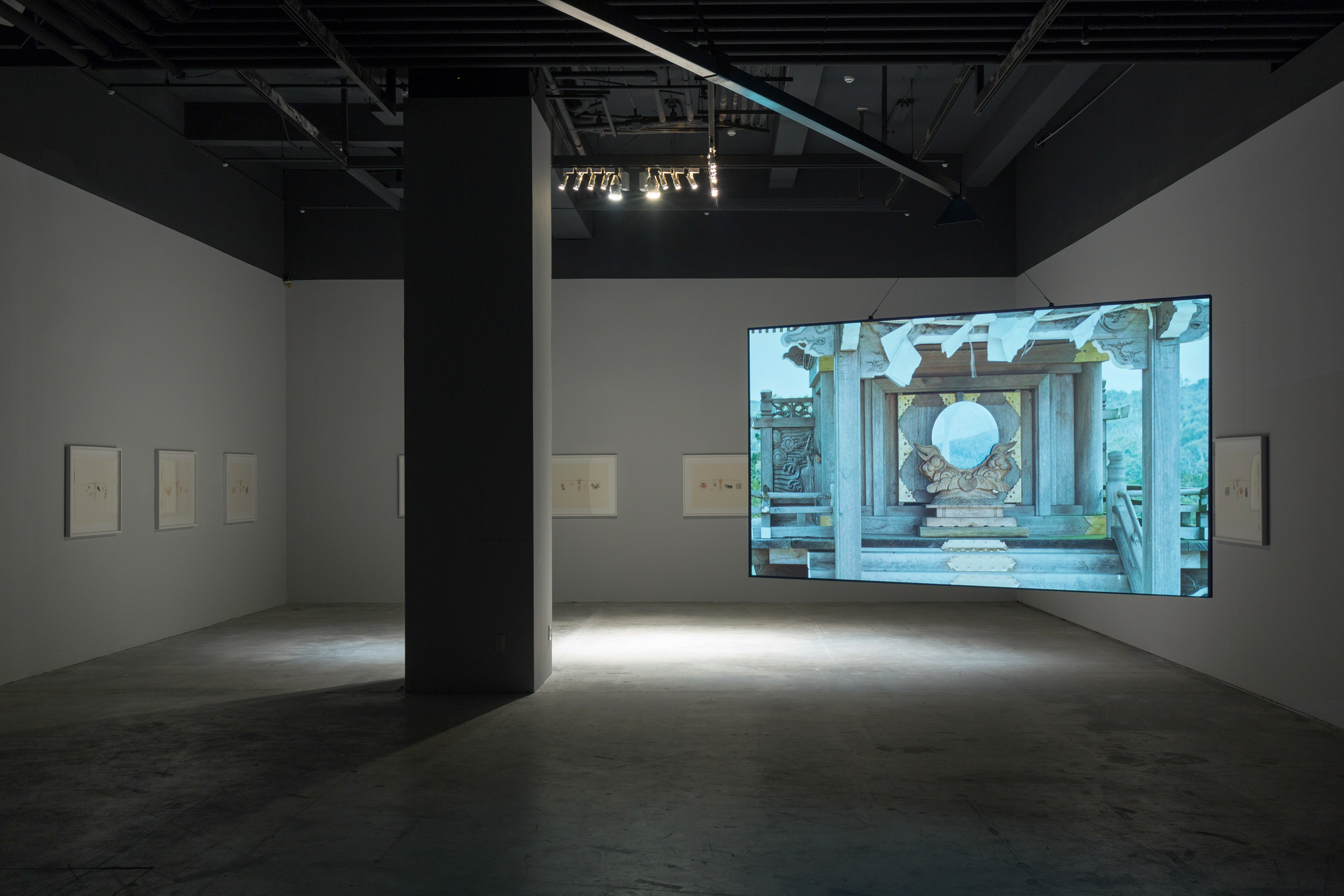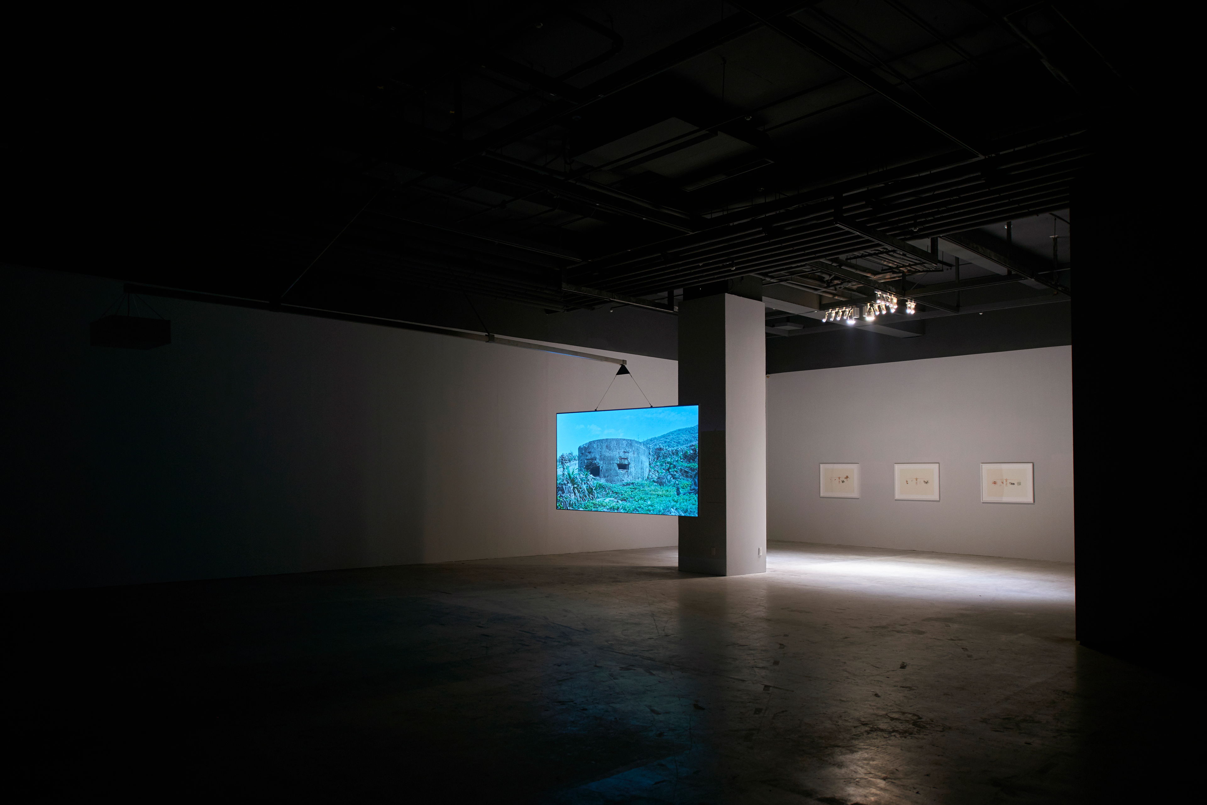This kinetic video-projection installation completes a full counterclockwise rotation each hour, allowing the audience to perceive actual physical time. The video recording has been divided into four sections of silent footage that gradually shift from black-and-white to full color. The images have been constructed using two sets of cameras: one set positioned at the Kusukusu Jiniya Shinto shrine on the mountain’s summit pointing toward Padriyiur Bay, the other set of cameras point toward Kus Kus Village from Padriyiur Bay; manually-operated flashes of light in the film emit series of Morris codes. Codes originating from the bay lists names and basic records of survivors of the 1871 Padriyiur Bay Incident, for instance, “Hirara Niya, Alive, in exchange for a cow” or “Shimabukuro Kame, alive, left documents”; codes dispatched from the summit toward the bay describe photographs (currently archived in the Pitt Rivers Museum of Anthropology at Oxford University) from the 1910 Japan-British Exhibition attended by Japanese officials and residents of Kus Kus Village, with content such as: “a wedding between Lungaya, 21 and Rechabury, 24, is performed as a show at the Formosan Hamlet on Sep 3, 1910.”