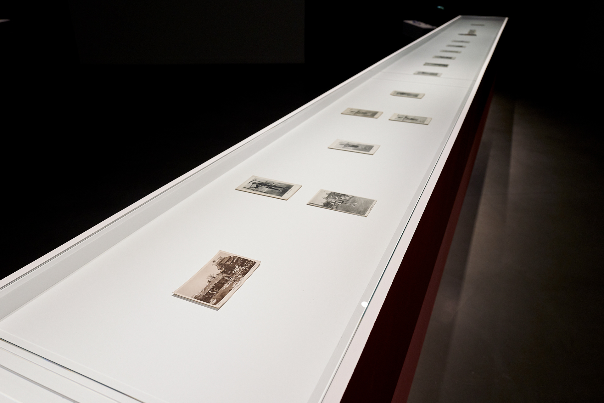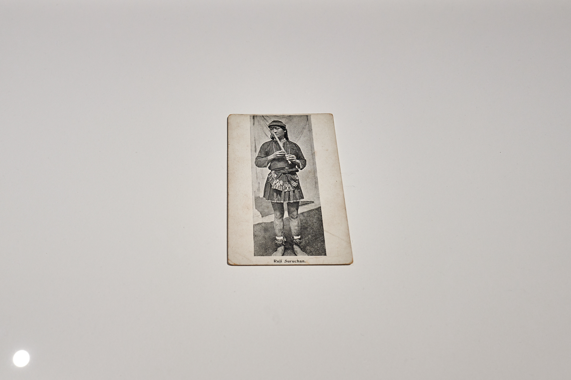 複合媒材/ 4張照片(每張15,6x11,2cm)、12張英日博覽會愛奴家明信片(每張13,7x8,8cm)、14張福爾摩沙村莊明信片(每張13,8x9cm)、紀念品:紙娃娃和白城市的影像印刷品(16x8cm, 44x6,2cm),上色台座 (1000×55×92cm, 48x42x170cm, 得利CP4色票名稱:殖民紅、愉快的櫻桃、嬰孩玩樂時間、英國玫瑰、茅草小屋、勇敢的嬰孩、硫磺爆炸、茶舞)/ 2021