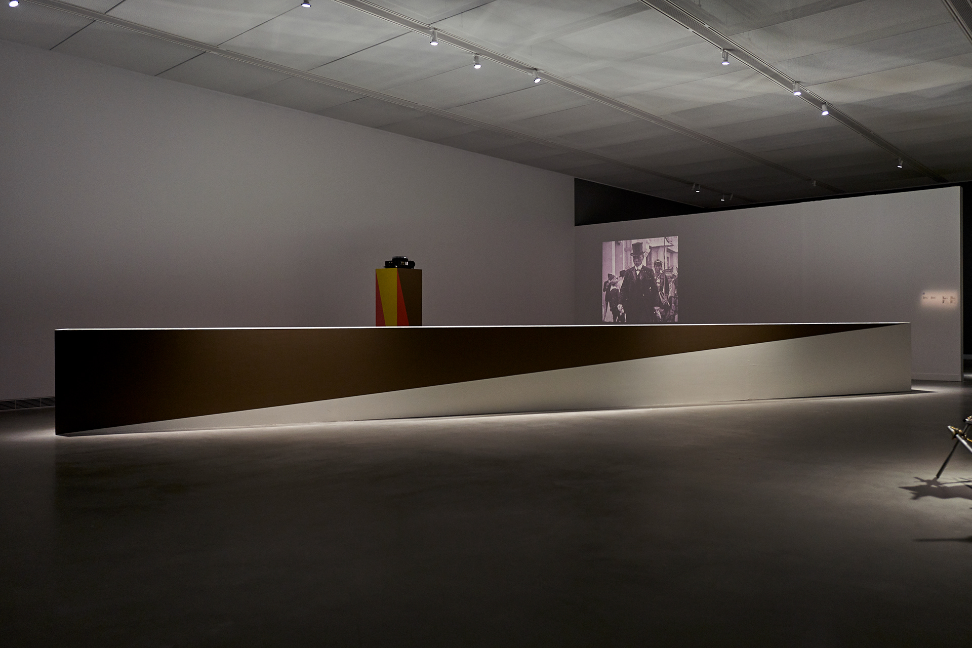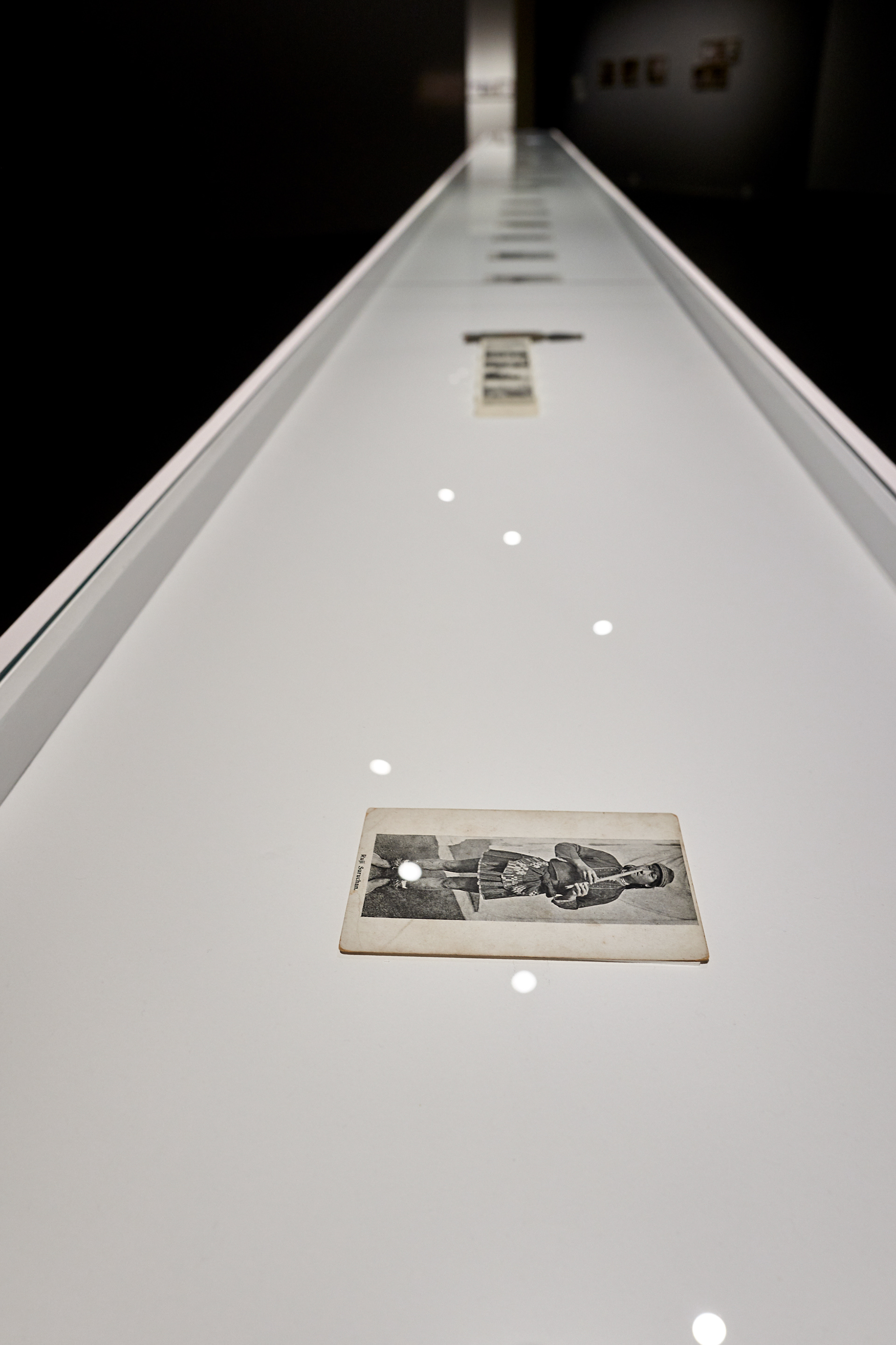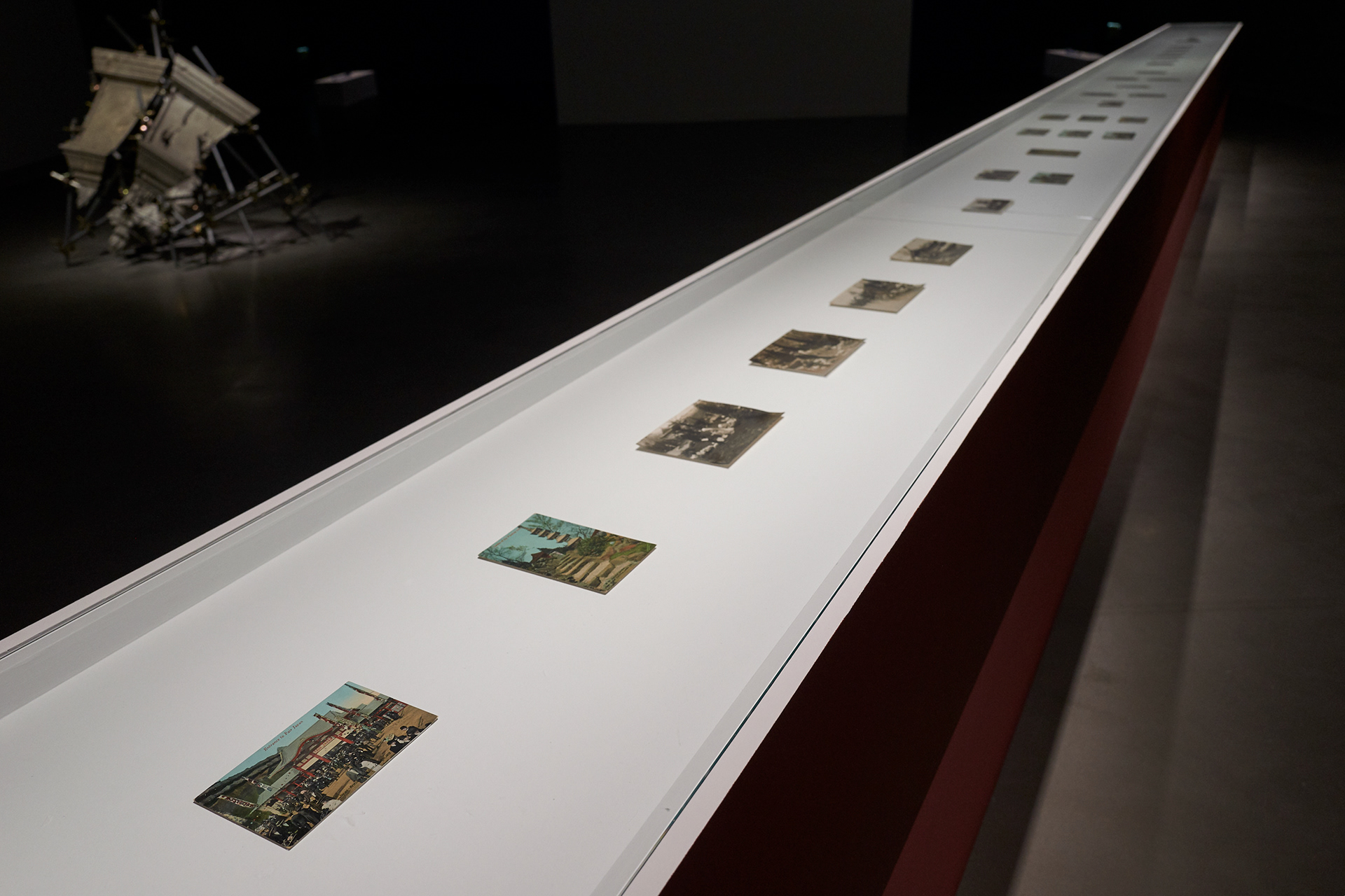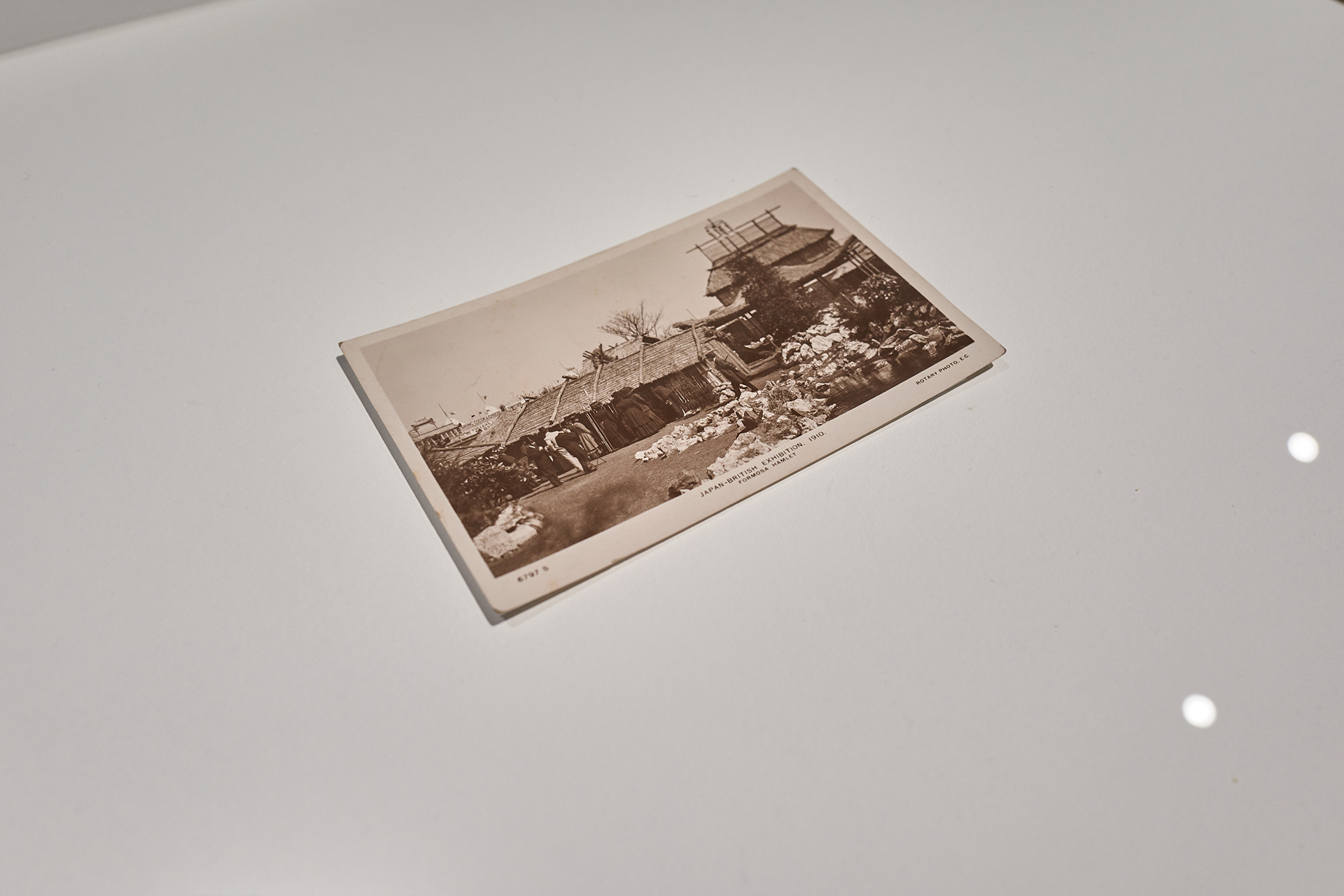Mixed Media/ Collection Radauer: 4 photographies (each 15,6x11,2cm), 12 Japan-British Exhibition Aino Home postcards(13,7x8,8cm), 14 Formosa Hamlet postcards(13,8x9cm), souvenir: cardboard doll with printed White City images sheet(16x8cm, 44x6,2cm) ,coloured plinthes (1000×55×92cm, 48x42x170cm, names in Dulux Colour Palette 4: Colonial Red, Cheery Cherry, Baby Playtime, British Rose, Thatched Cottage, Brave Baby, Sulphur Burst, Tea Dance) / 2021