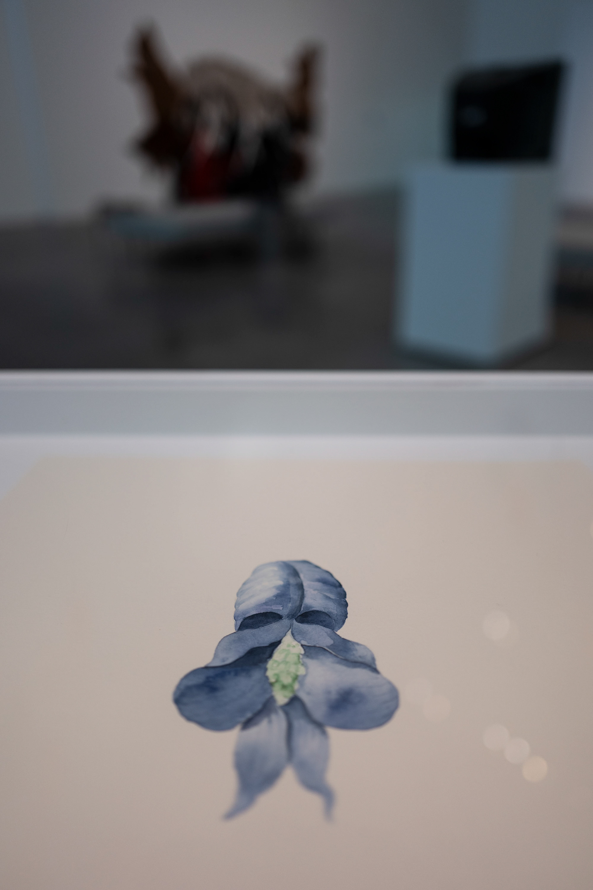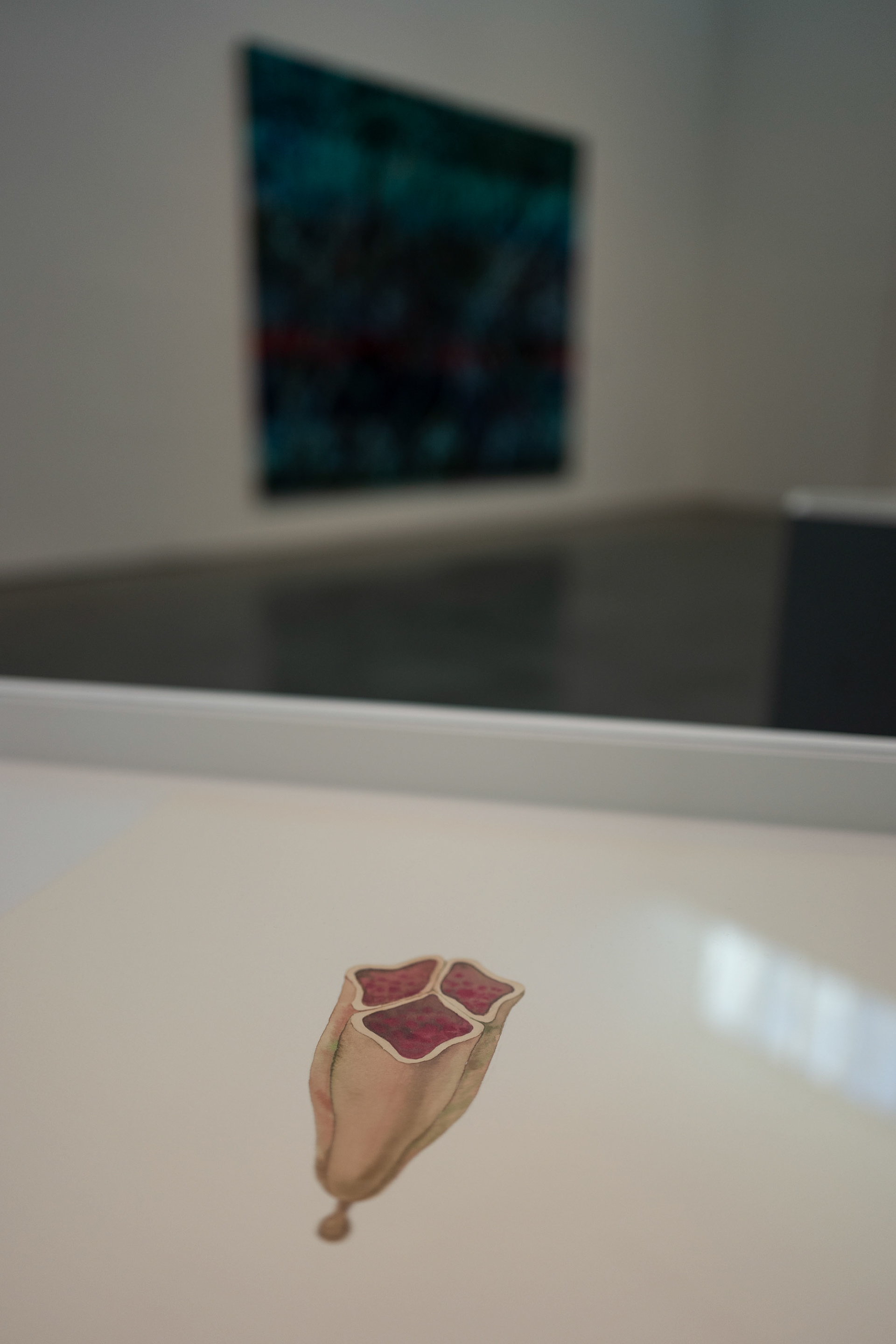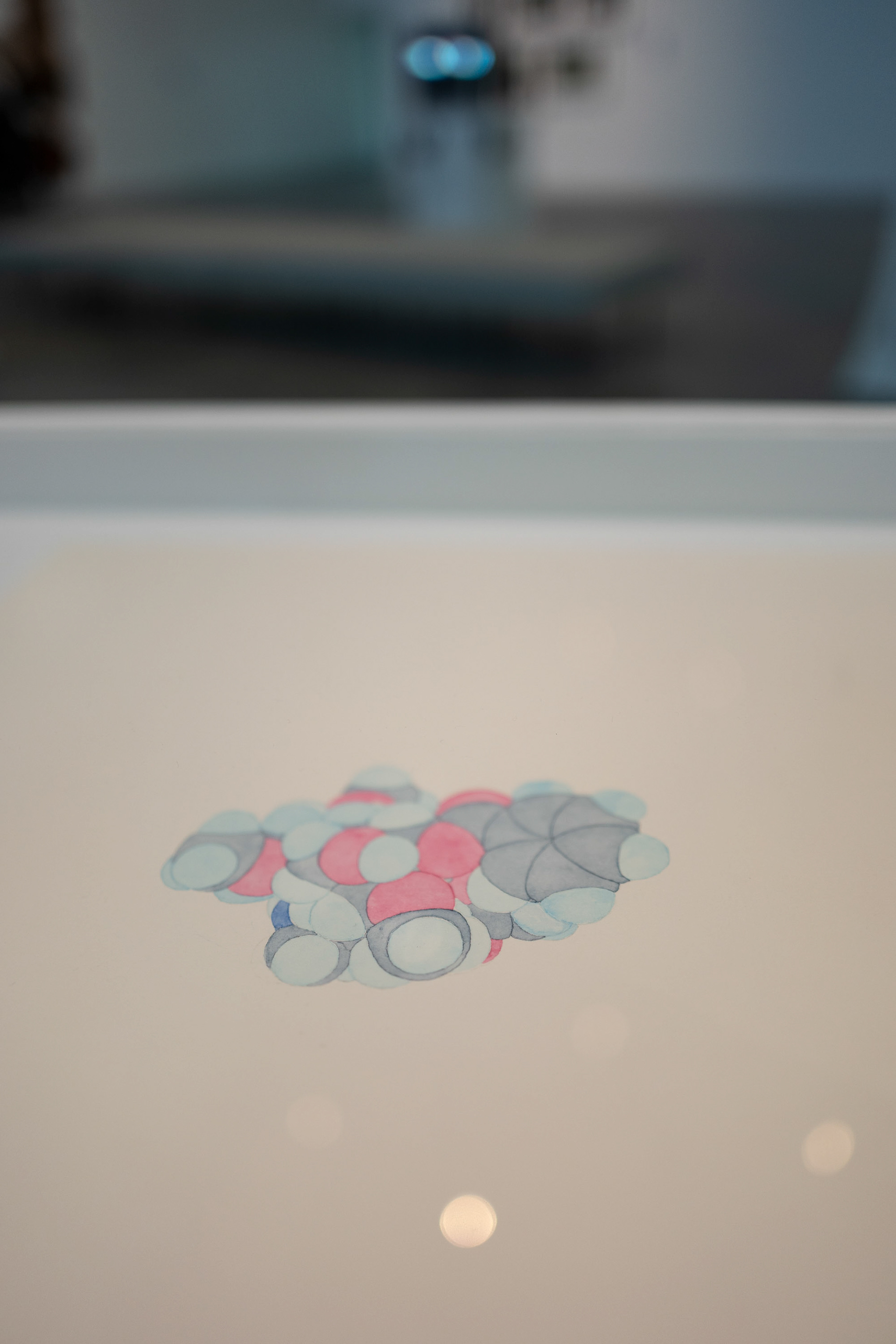 Interspersed among these monochromatic pencil drawings are partial images of plants rendered in colored watercolor. Some resemble anatomical diagrams, while others evoke molecular structure diagrams. What these images share is that all of the plants depicted are toxic and have played multiple roles in human history: some have been used as medicine; some (such as castor bean) were once employed in assassinations; some are sources of narcotics; and others have been developed into analgesics or anti-cancer drugs.