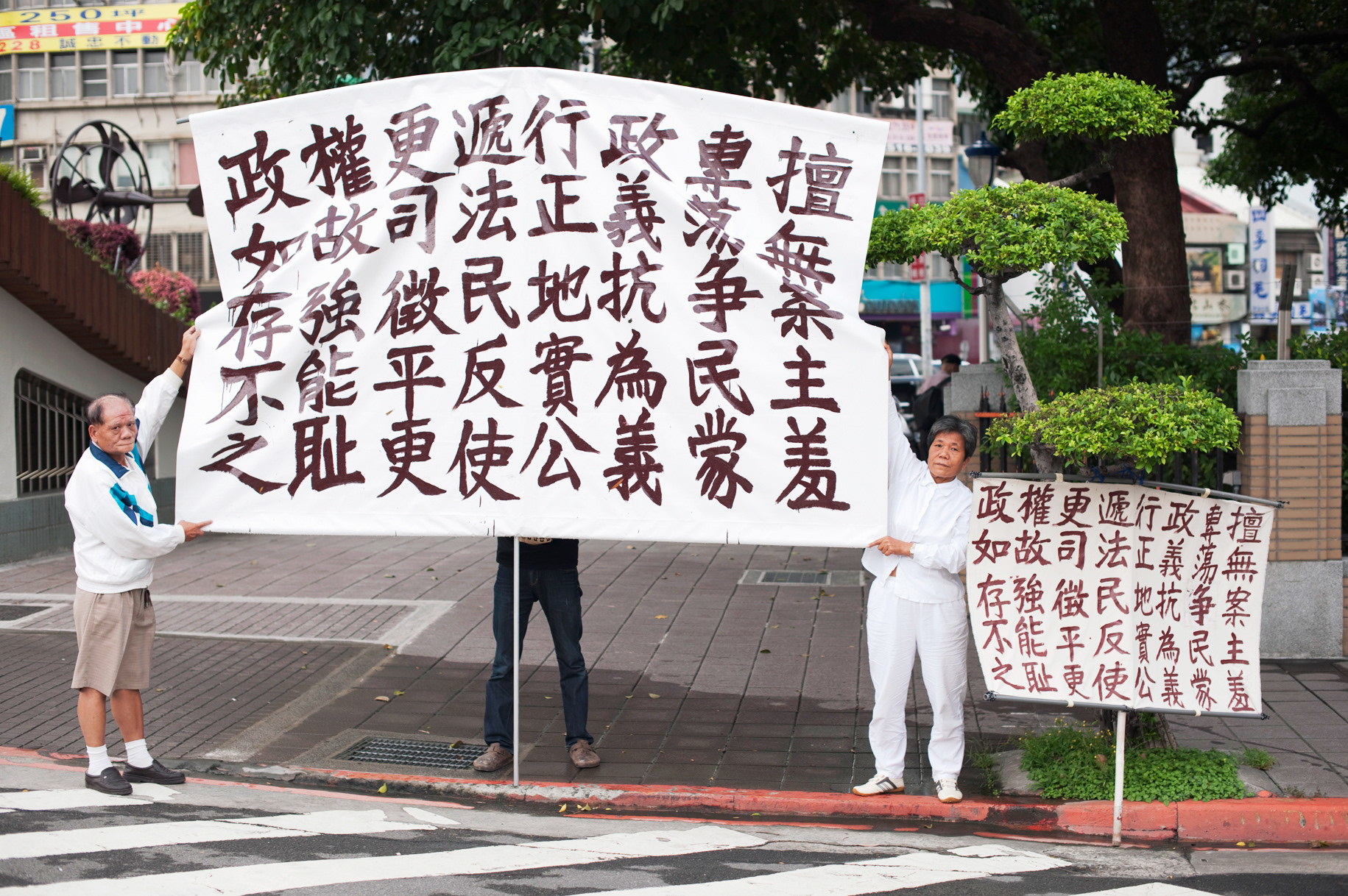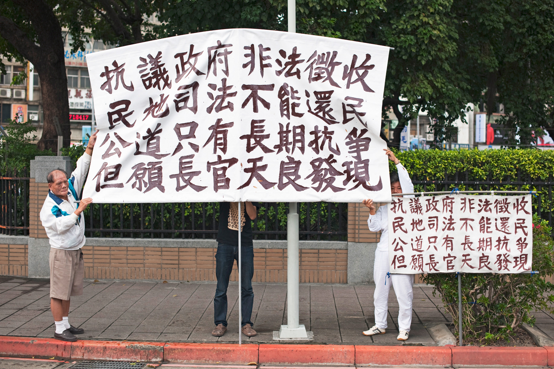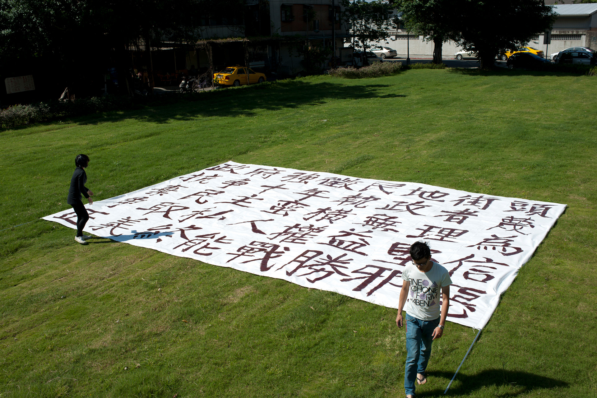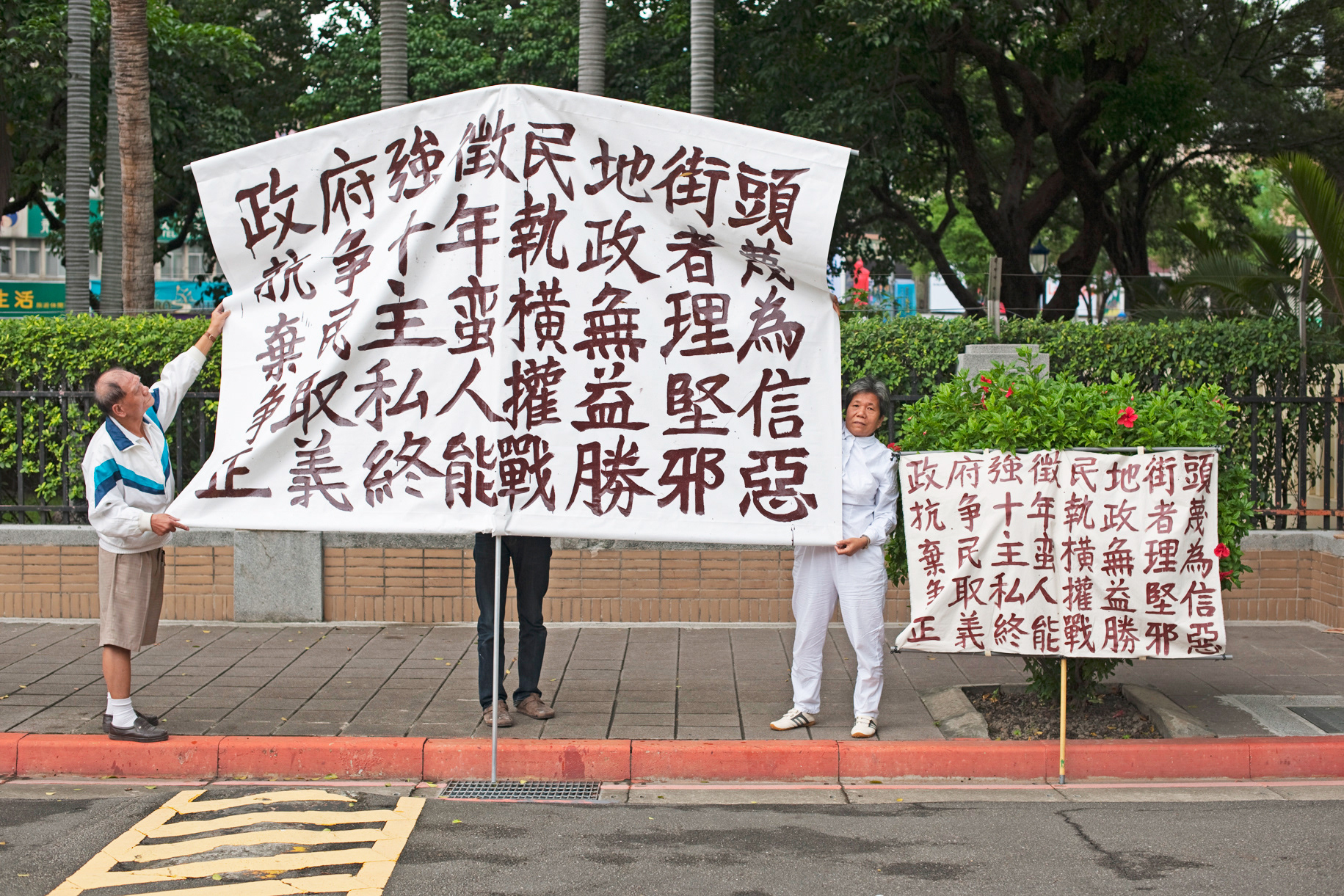 It is a collaboration work with two brother and sister who have been protested for 10 years for their land taken by the government. I replace woman’s husband to pro- duce banners for them and in discussion she hope I could enlarge them so I enlarge 2 times and 6 times from their original one which is 150x100cm.
